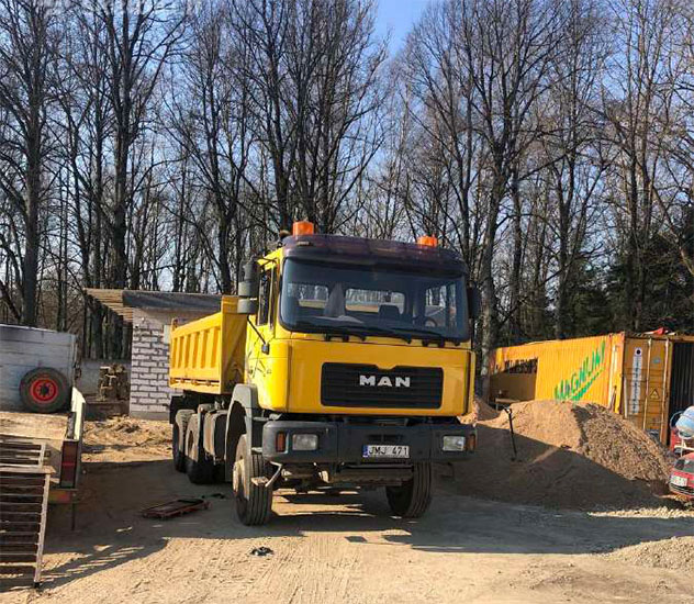 Vežame sijotą žvyrą, smėlį, juodžemį. Išlyginame teritoriją, ruošiame pagrindus, užpilame augalinį sluoksnį.