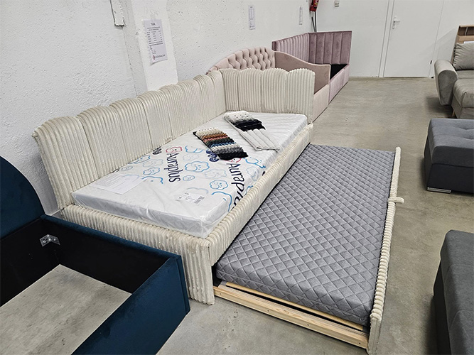Lovos, minkštasuoliai, naktiniai staliukai, pufai